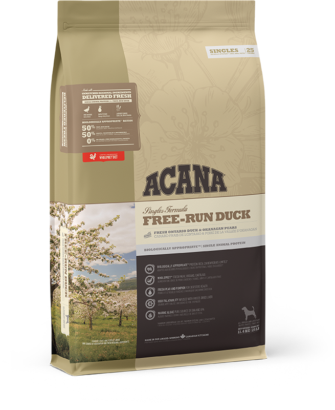 A korlátozott összetételű ACANA Free-Run Duck 50 % kacsából készült. A könnyen emészthető, ízletes hús a kizárólagos állati fehérjeforrás, ezért allergiagyanú esetén is tökéletes választás, például egy eliminációs diétához. A kacsa frissen vagy nyersen érkezik, a WholePrey™ arányainak megfelelően a hús mellett belsőségeket és porcokat is tartalmaz. A friss Bartlett körte, a spárgatök és a pézsmatök bőségesek vízben oldható étrendi rostokban, ezért érzékeny emésztőrendszerű kutyusoknak is megoldást jelenthet.