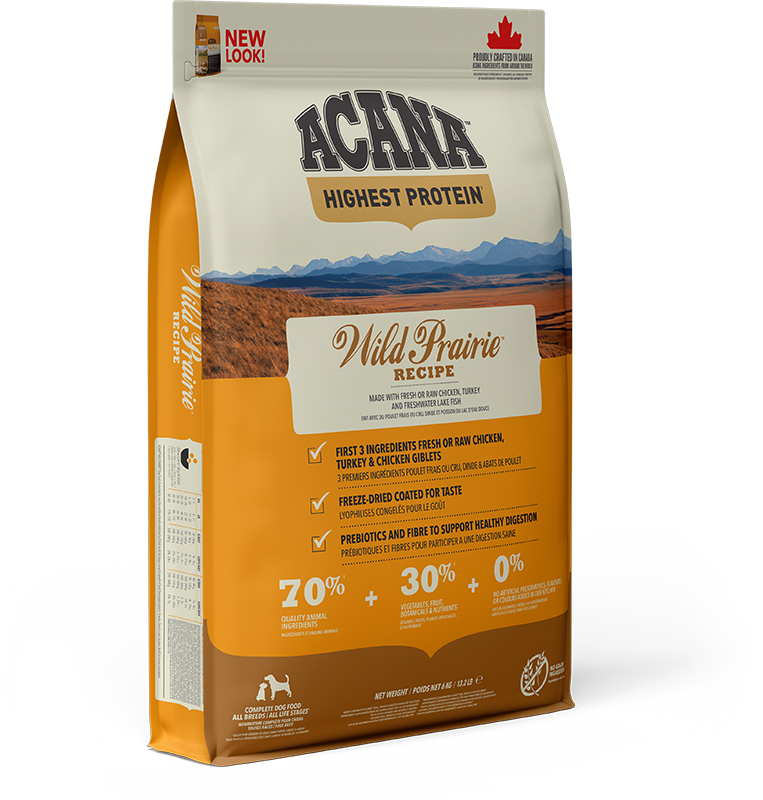 Csirke, pulyka, tojás és édesvízi tavi halak frissen vagy nyersen* érkeznek, majd alacsony hőmérsékleten feldolgozzuk az értékes alapanyagokat és kész a tápanyagdús ACANA Wild Prairie. A halakat egészben, a baromfit porcokkal és emészthető csontokkal együtt használjuk fel lemásolva az elejtett préda összetételét. Fagyasztva szárított csirkével és csirkemájjal vonjuk be a tápszemcséket, fokozva az illatorgiát.