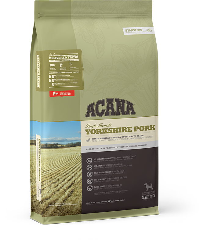 Az ACANA Yorkshire Pork egy monoprotein táp, amely érzékeny kutyáknak ajánlott, fajra és méretre való tekintet nélkül. A táp 50% prériszerű farmok tenyésztésből származó sertéshúst és 50% gyümölcsöt, zöldséget és gyógynövényt tartalmaz.