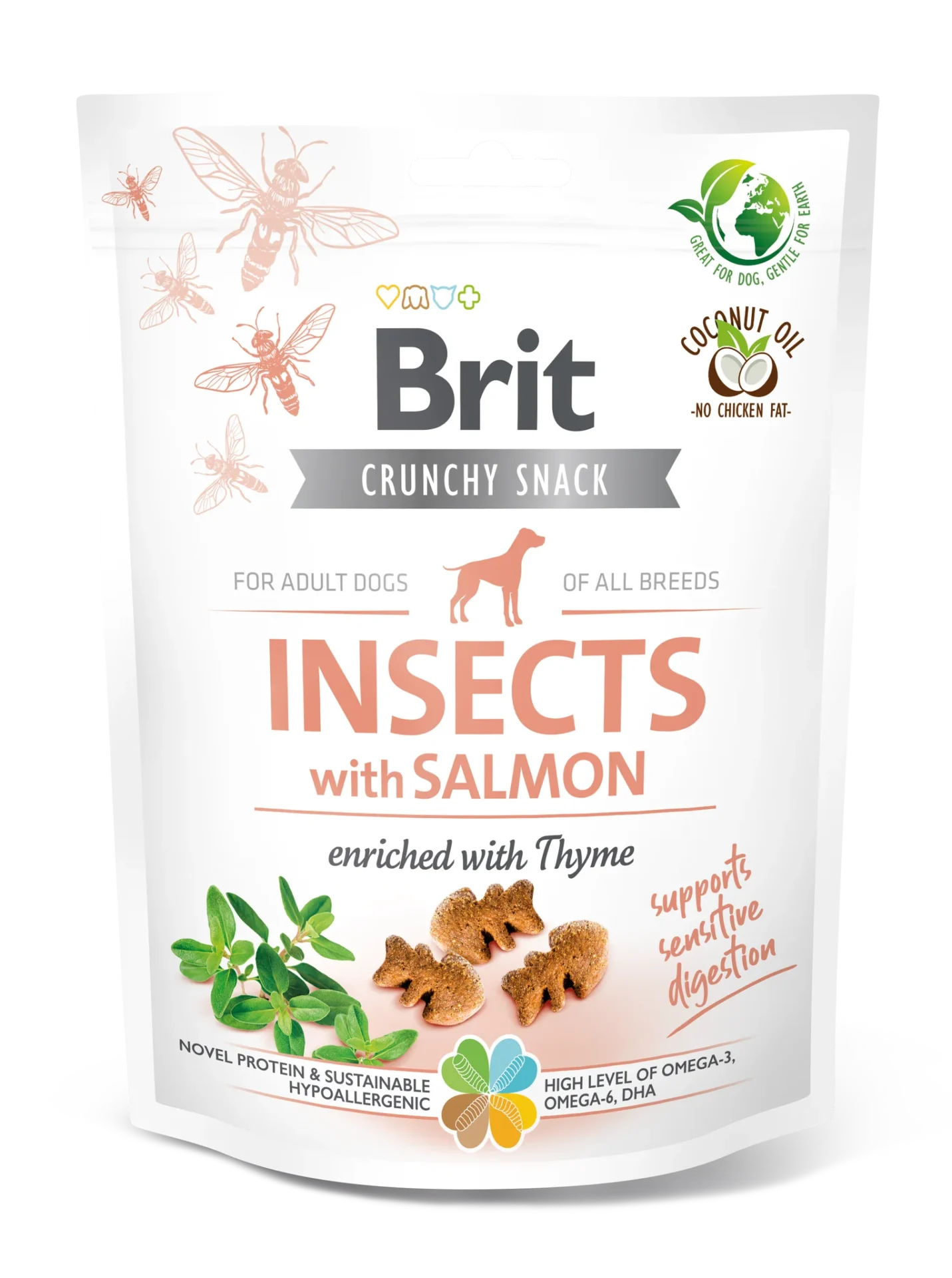 Brit Care Crunchy Cracker Insects with Salmon – Ropogós csemege rovarokkal és lazaccal, kakukkfűvel dúsítva.