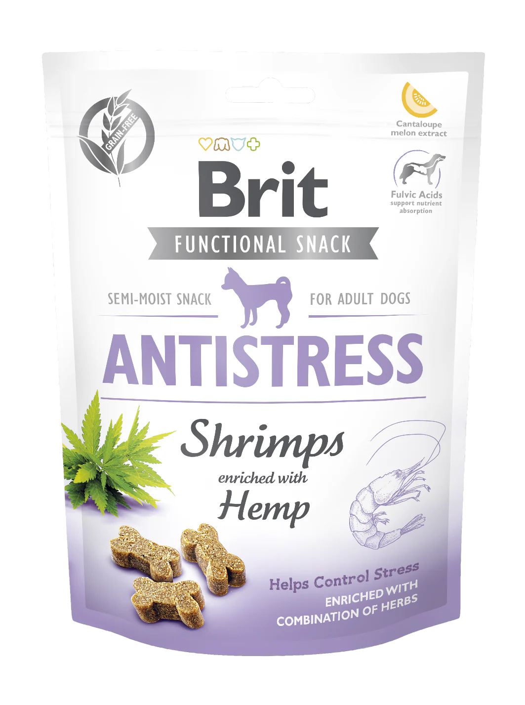 Brit Care Functional Snack gabona és burgonyamentes, a benne található fulvinsavak támogatják a tápanyagok felszívódását, a cantaloupe dinnye kivonat antioxidánsok forrása.