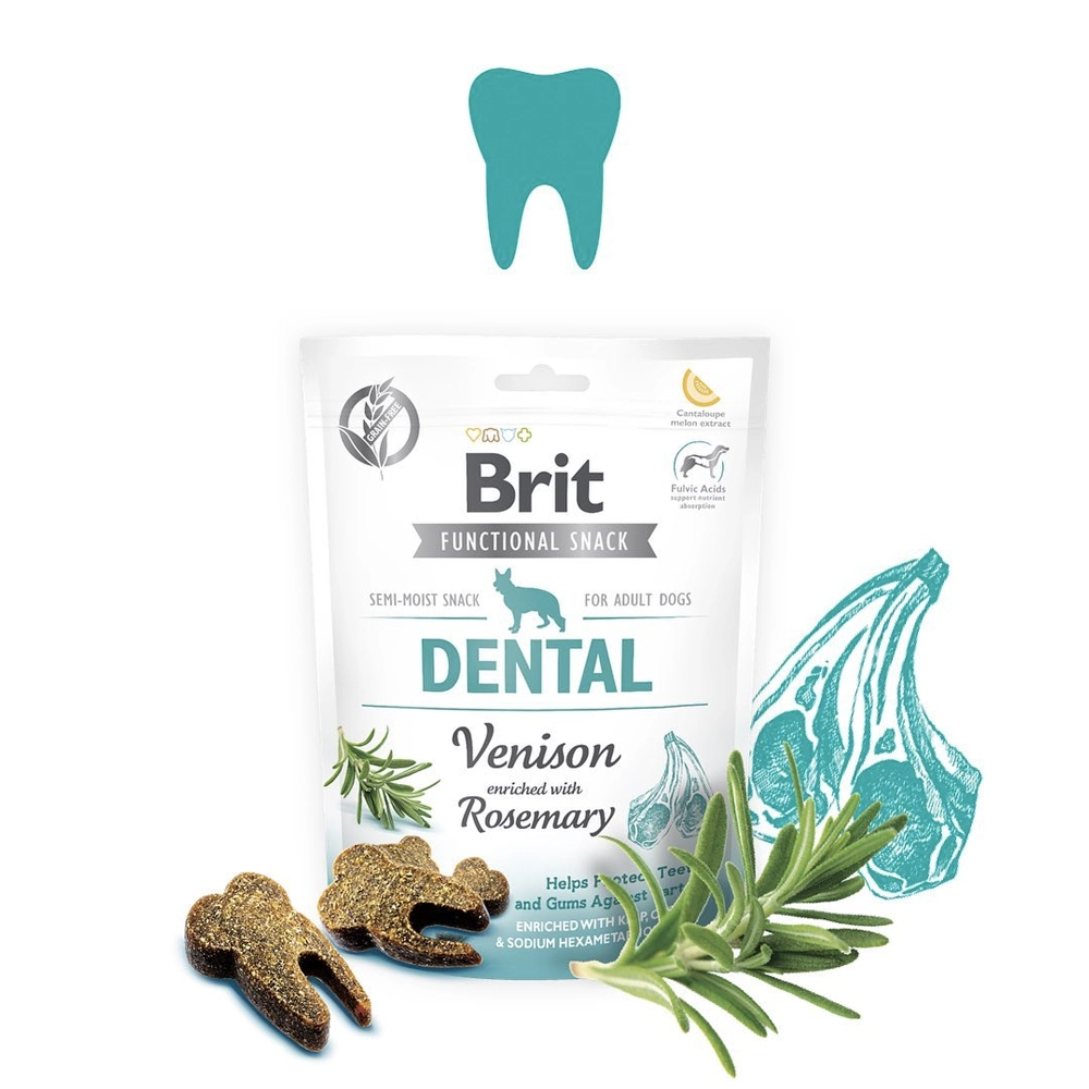 A Brit Care Functional Snack Dental a zsálya, a szegfűszeg és a nátrium-hexametafoszfát segítségével járul hozzá a fogak és a fogíny védelméhez (félkemény jutalomfalat, rozmaringgal dúsított vadhús).