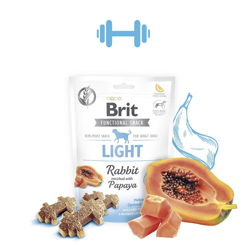 A Brit Care Functional Snack Light segítséget nyújt az optimális testfittség fenntartásában (félkemény jutalomfalat, papayával dúsított nyúlhús). Psylliummal és bambusz lignocellulózzal dúsítva, amelyek az optimális bélrendszeri egészség fenntartásához szükséges rostforrások.