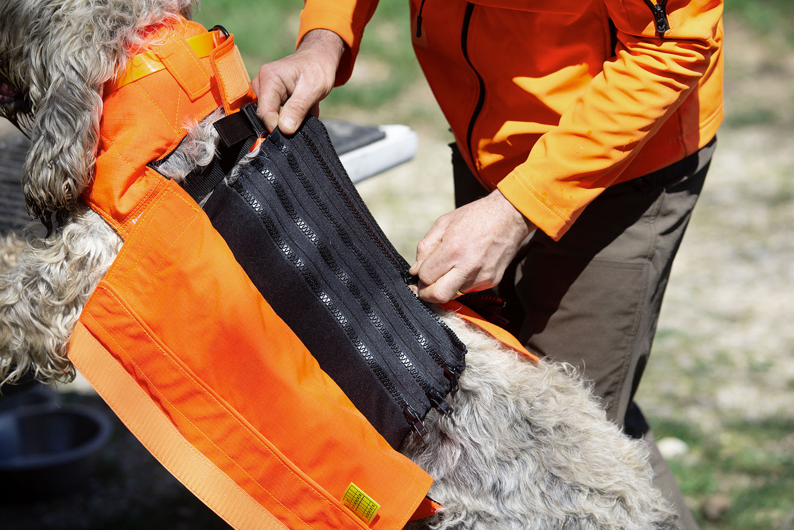 - Zip Closure System: melynek segítségével a mellény jobban igazodik a kutya morfológiájához. Plusz a mellény két további 2,5 cm széles zárral rendelkezik, amelyek egy összehúzó csattal megkönnyítik a mellény felhelyezését a kutyára.