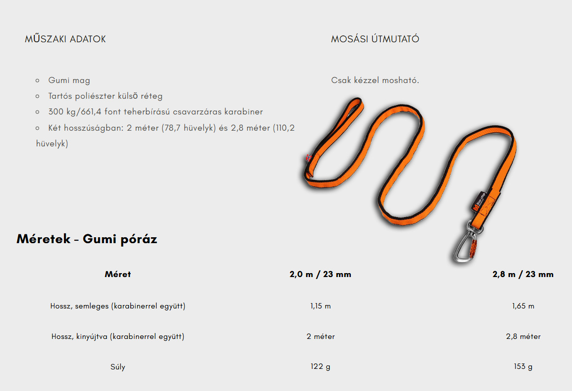 A Bungee póráz három színben (aqua, narancs/fekete és kék) és két hosszúságban kapható. A 2 méteres megfelelő irányítást tesz lehetővé túrázás és futás közben. Míg bikejöringhez és skijöringhez a 2,8 méteres pórázzal tartható a kutya és a kerékpár, vagy síelő közötti biztonságos távolság.